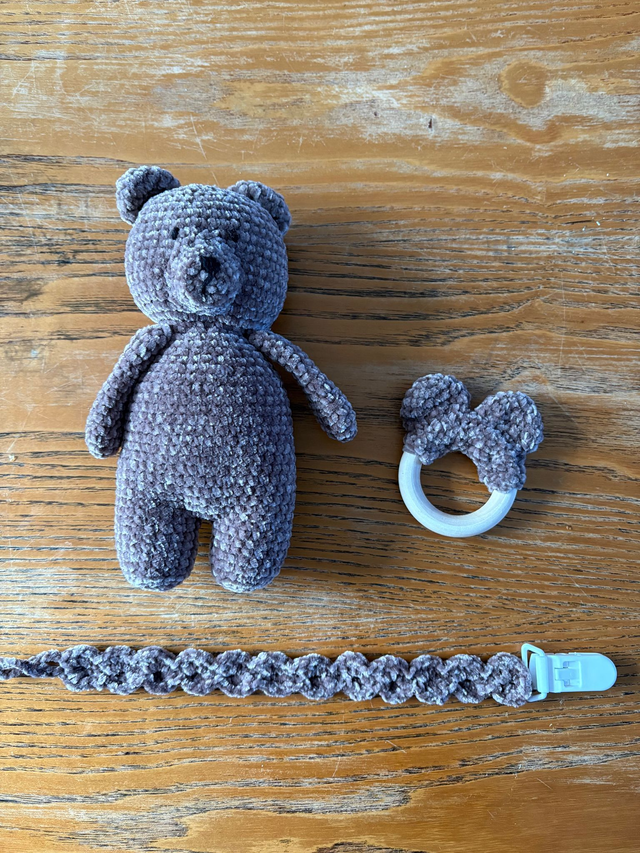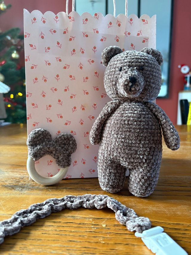 Un coffret artisanal composé d’une grande peluche ours brun, d’un hochet oreilles d’ours et d’une attache-tétine ondulation. Parfait pour un cadeau de naissance doux et utile.