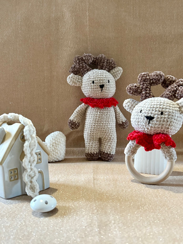 Un ensemble artisanal composé d’une grande peluche renne avec col rouge, d’un hochet tête de renne et d’une attache-tétine.